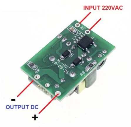 This AC to DC step-down module is designed to convert alternating current (230 VAC) power to direct current (DC) power while reducing the voltage (5 VDC).
