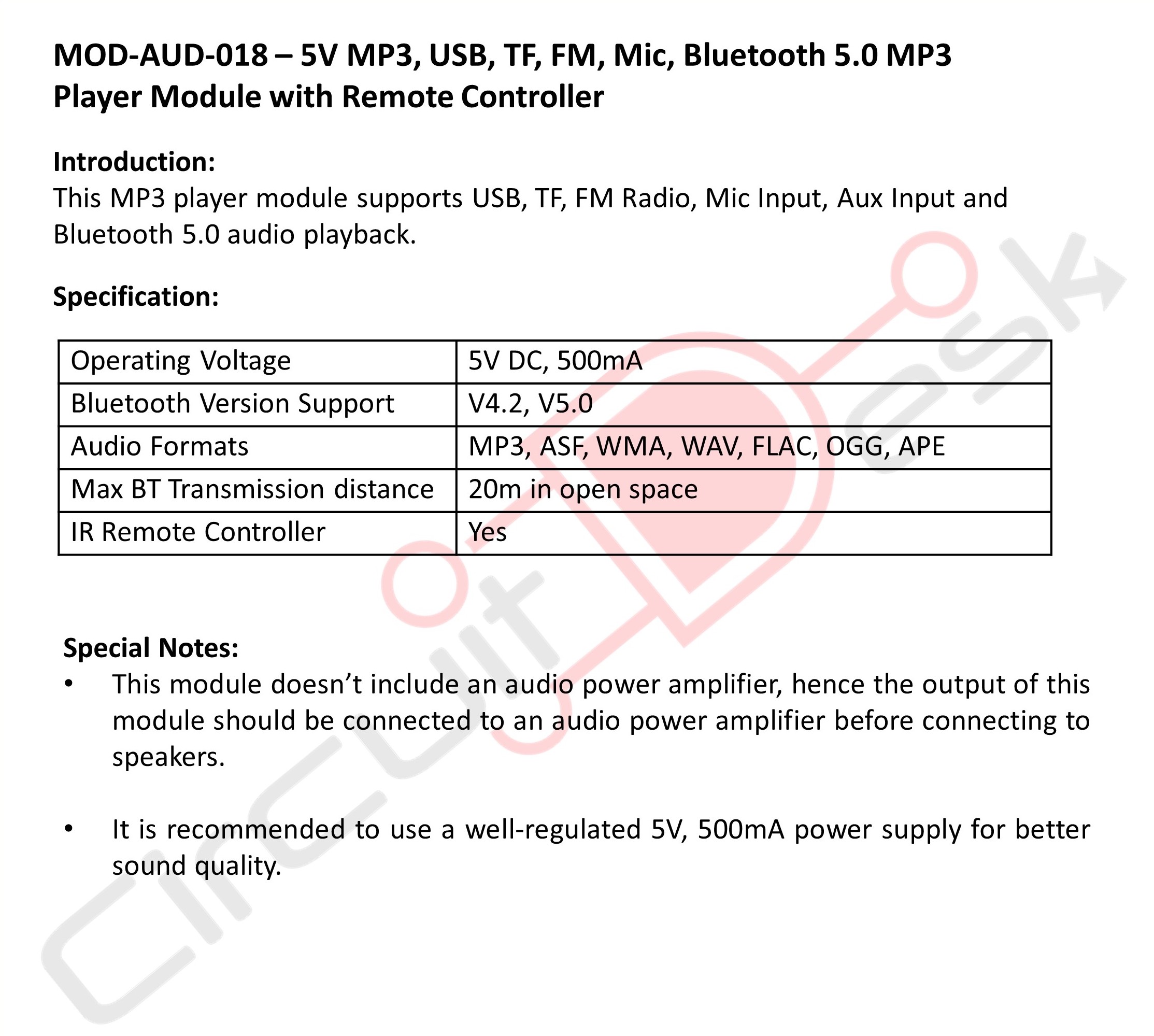 Please note: This module doesn’t include an audio power amplifier,